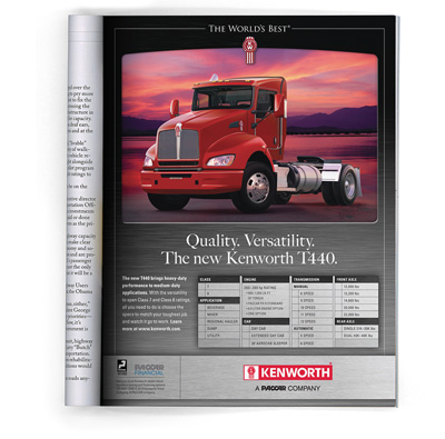 “Business and fleet owners seeking a lower weight, top-quality, versatile truck are now seeing our new trade ad for Kenworth’s new T440, the company’s latest addition to its medium-duty family of trucks. Filling an important niche between heavy-duty Class 8 trucks and medium-duty Class 7s, the T440 delivers efficiency, maneuverability and up to 380 horsepower to handle most any application with the quality, reliability and durability you’d expect from Kenworth.”