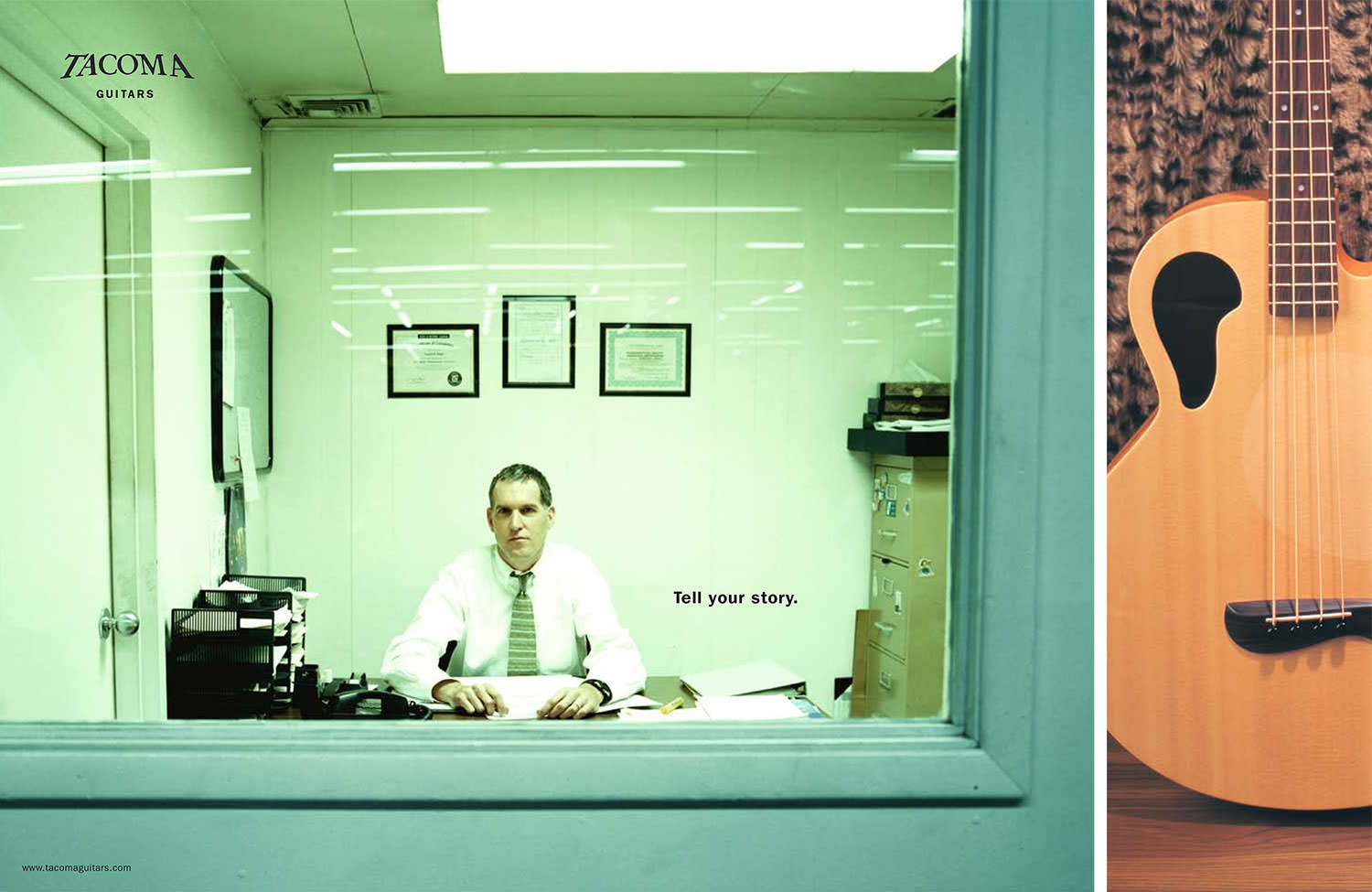 Point of sale and print advertisements for guitar players: Tacoma Guitars is an instrument for serious players. The "Tell your story" ad campaign connected with players by showing that Tacoma understands why they play in the first place. Awards: Best in Show, National ADDYs, ARCHIVE Magazine.